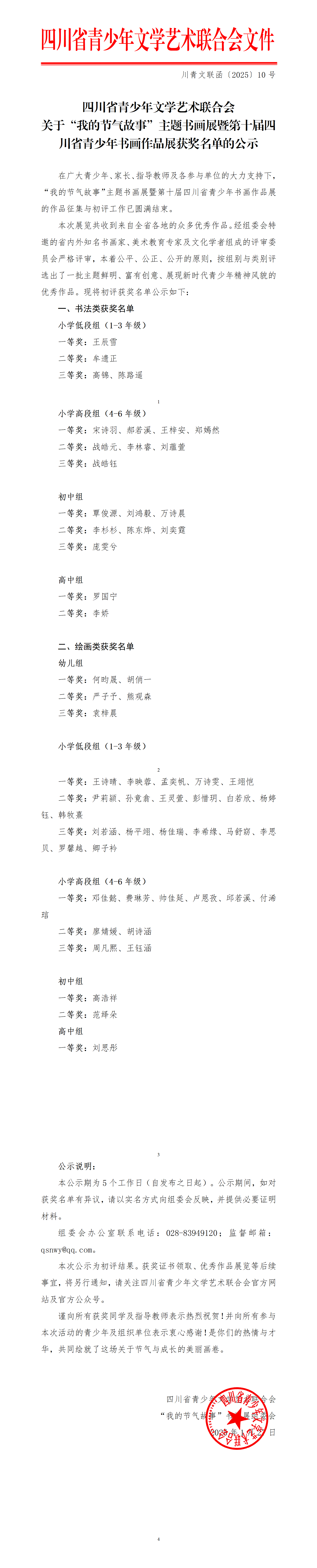 关于“我的节气故事”主题书画展暨第十届四川省青少年书画作品展获奖名单的公示